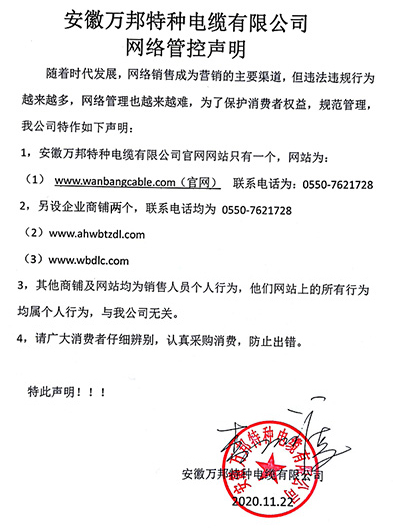 鄭重聲明:安徽萬邦特種電纜有限公司官方網站為:www_wanbangcable_com.shwhj.cn,除此之外無任何子網站或合作網站,其余均為假冒偽劣。電話:0550-7621728 13485756353 地 址:安徽省天長市滁州高新技術產業開發區經四路29號
